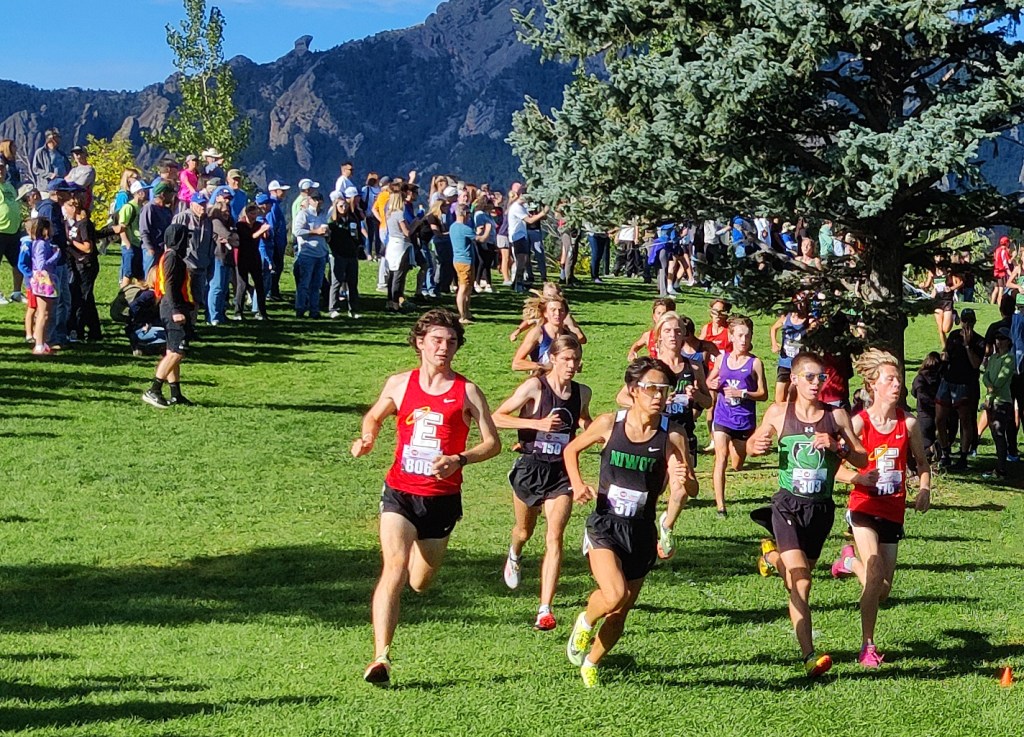 The Invitational season concluded at the Pat Patten Invitational at Viele Lake in Boulder, adjacent to Coach Kohuth’s alma mater, Fairview High School. The views of the Flatirons on Saturday were better than fair, as were many of Denver East’s performances on the rolling, multi-surface course, which was slick and muddy in places following the thunderstorms from the day before.