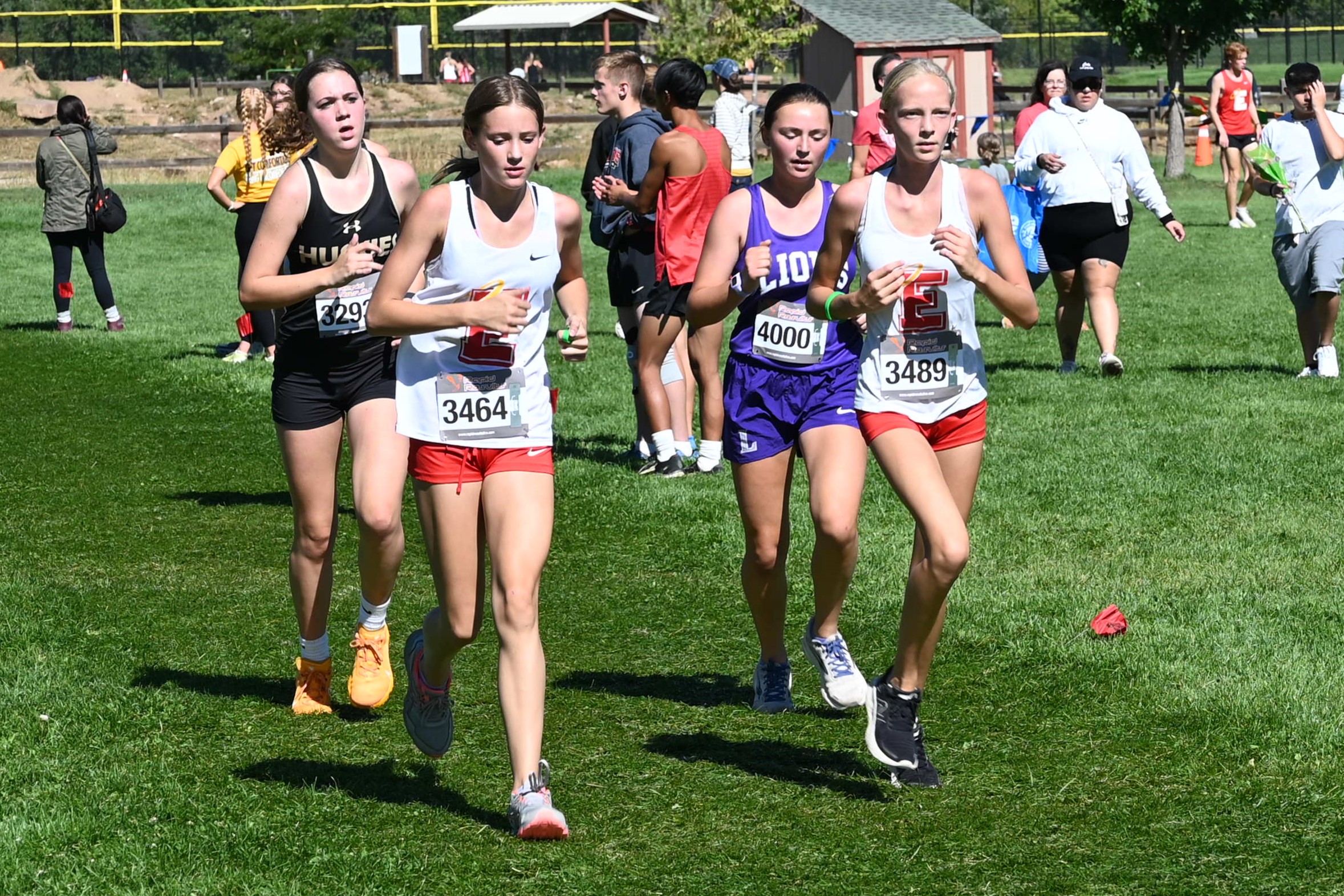 The Varsity Girls, who had started their warm-up no fewer than three times in anticipation of racing immediately after the JV Boys, took to the course next. Girls from more than thirty schools and at least seven states were represented in the Gold Varsity Division. The Denver East Girls were for the most part conservative in their approach to the course, where the toughest hills all come in the third mile. Sophomore Rosie Mucharsky ran from the back of the lead pack through the first mile and held on to finish 8th in 18:30. Most of the rest of the Angels scoring pack came through the first mile in around 70th place and had moved up to near the top-50 as they climbed the hills early in the third mile. Ultimately, it was ninth-grader Corrine Kennedy who had one the best finishes of her young career to be the 2nd Angel in 40th place in 19:44, crossing the line along with sophomore Julieta Ochoa who took 41st also in 19:44. Ninth-grader Avery Johnson wasn’t far behind, taking 49th in 20:00, while sophomore Scout Chomas held on for 72nd place in 20:26, to close out the scoring for the Angels. Senior Sophia Shiroff placed 105th in 21:06 and sophomore Mary Clare Nussbaum 125th in 21:24. The Angels totaled 190 points to grab an impressive 2nd place team finish against a deep field of teams.