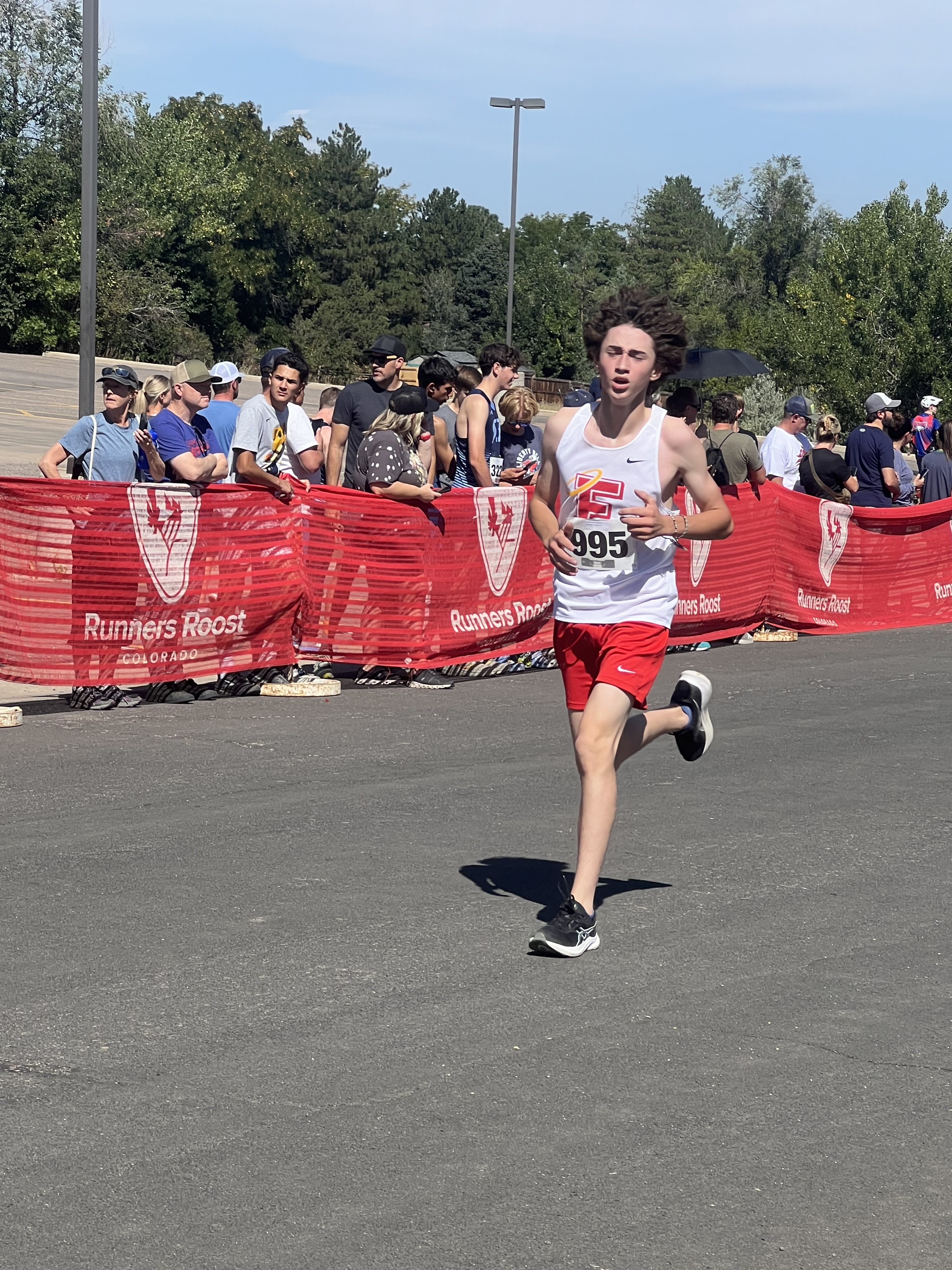 In a morning full of races, the Varsity Sweepstakes races are the first to take the course; the Sweepstakes Division is for those teams and individuals ranked near the top-10 in their classification at state regardless of school size, while the rest of the day’s races are divided by school size. Senior Jonas Scudamore was the first off the line for the Angels, running with a large lead pack through the first mile in the low 4:40’s. There was only minimal separation through the second mile, with the race stringing out a bit only over the last half mile. Scudamore crossed the line in 10th place in 15:06, a personal best performance that moved him up to #2 all time for East runners in races run in Colorado (altitude).