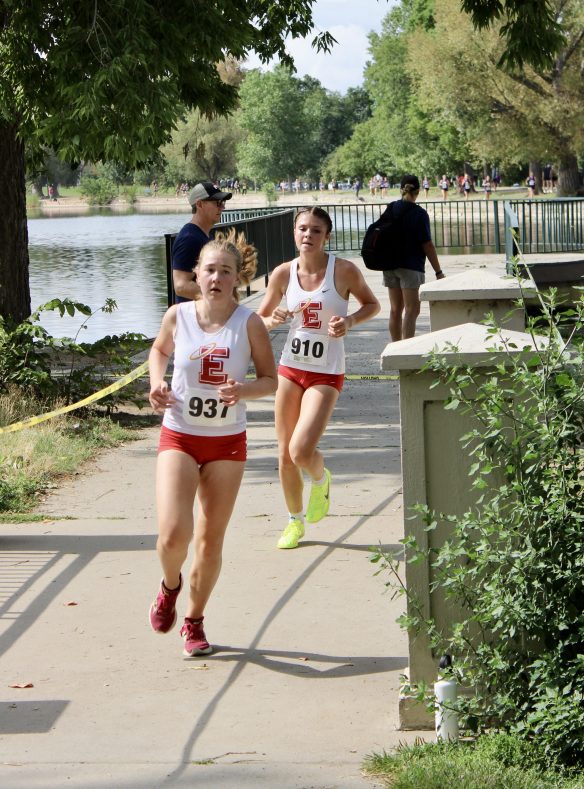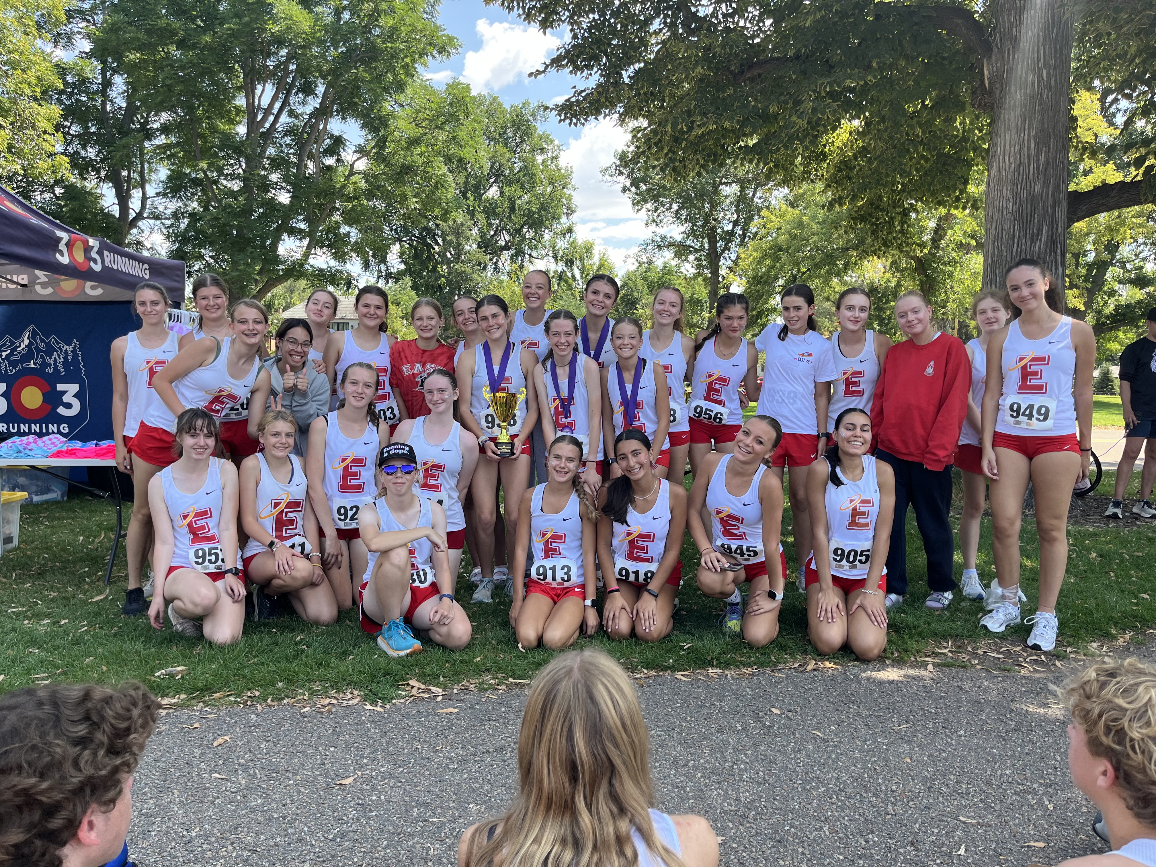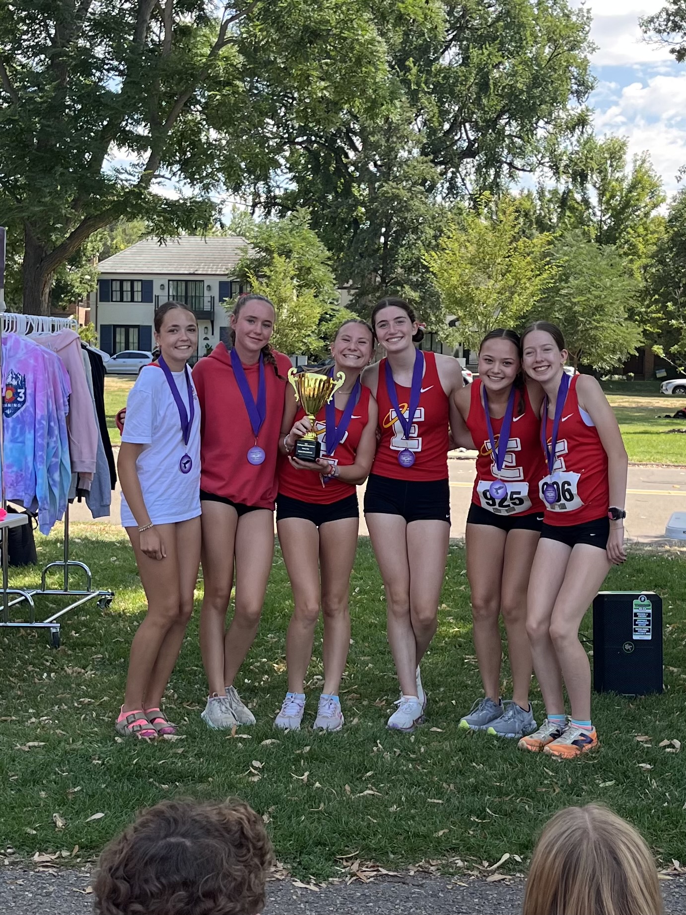 The pack of junior Avery Johnson, senior Julieta Ochoa, senior Scout Chomas, and junior Corrine Kennedy established themselves right where they were expected and needed to be in the first mile of the Girls Varsity Race, all running in the top 20. (After three years racing like this, these four need a moniker, maybe “JOCK.” They can come up with their own catchphrase). By the 2-mile mark Johnson and Ochoa had established a bit of a gap on the other two and were closing in on the top 10, while Kennedy and Chomas had moved into the top 15. By the final 200m, Johnson had moved into 8th place, but with what appeared to be too distant a gap to catch the next runners ahead of her; Johnson unleased a wicked finishing kick, moving past runners from ThunderRidge and Cherry Creek to grab 6th place in 18:57 – one of the developments in the final stretch of the this race that would prove decisive in the team scoring. Ochoa held on to 11th in 19:13, while Kennedy and Chomas moved up to 13th and 14th in 19:31 and 19:33 respectively. Meanwhile, there had been some heroics going on behind JOCK. Senior Mary Clare Nussbaum, making her season debut, was not much better than 60th place at the mile. Approaching 2 miles, she had moved up very nicely to around 30th. Crossing the bridge entering the final 200m, Nussbaum had moved all the way up 18th place, finishing in 19:48; among the girls she had passed in that final mile were the 4th and 5th runners for ThunderRidge High School. When the dust/mud had settled, the East Angels had a total of 62 points, 2 points better than ThunderRidge High School, taking the team title. Junior Lola Carhart, better than a minute faster and eight places further up than a year ago, finished in 44th in 20:38, and junior Grey Jenson was 133rd in 23:47.