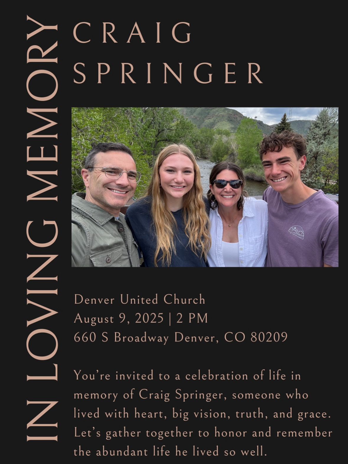 Last week we lost a member of our Denver East Cross Country family. Information on celebrating the life of Craig Springer, father of senior/captain Isaiah Springer and loyal supporter/volunteer for East XC, is below. Please reach out to your coaches on how we can support Isaiah, his mother Sarah, and sister Isabelle. Thanks.