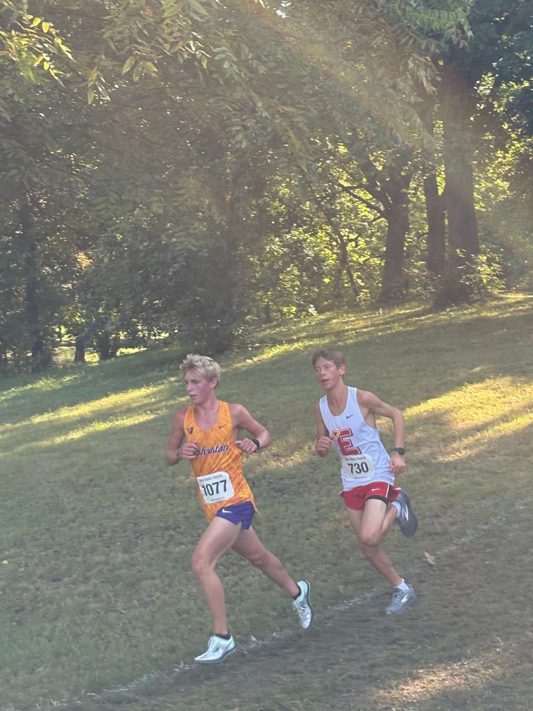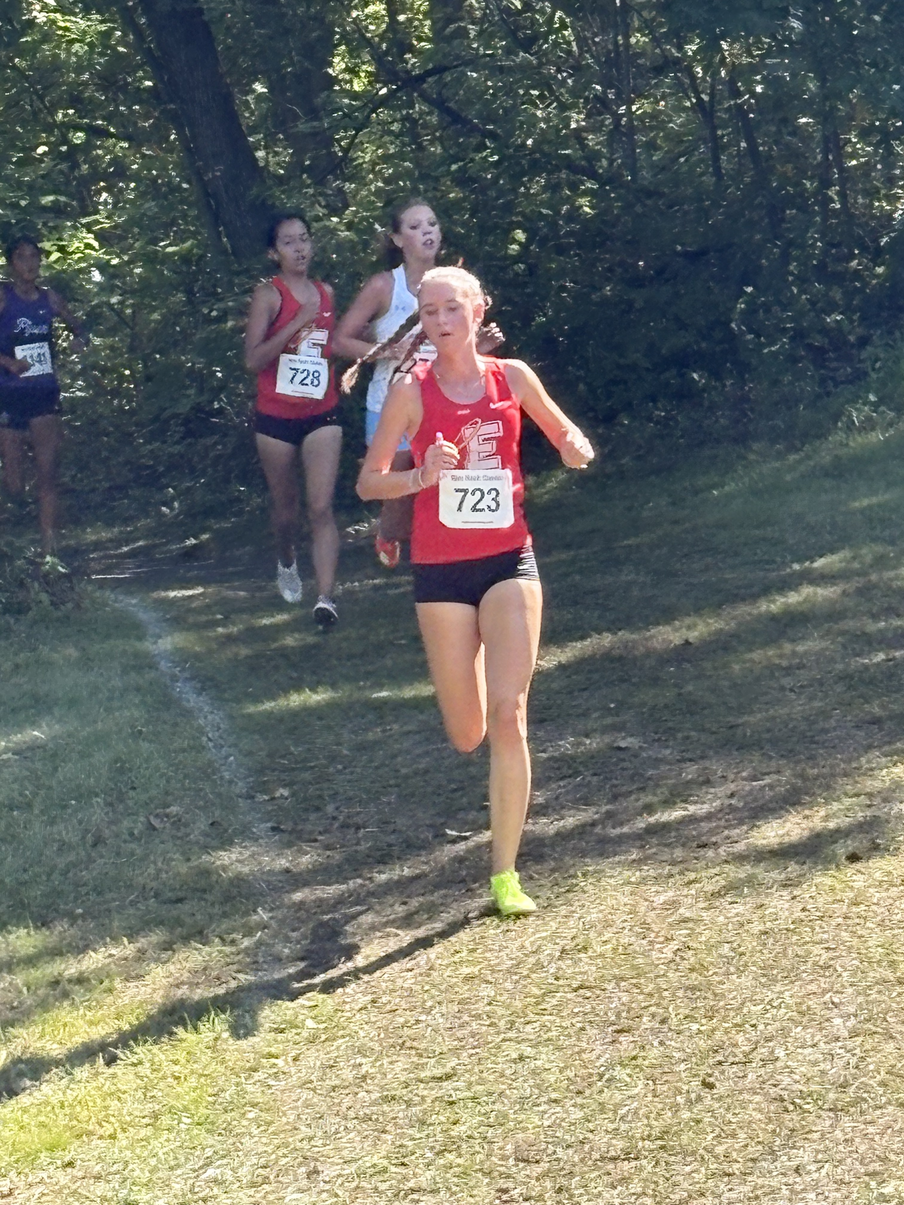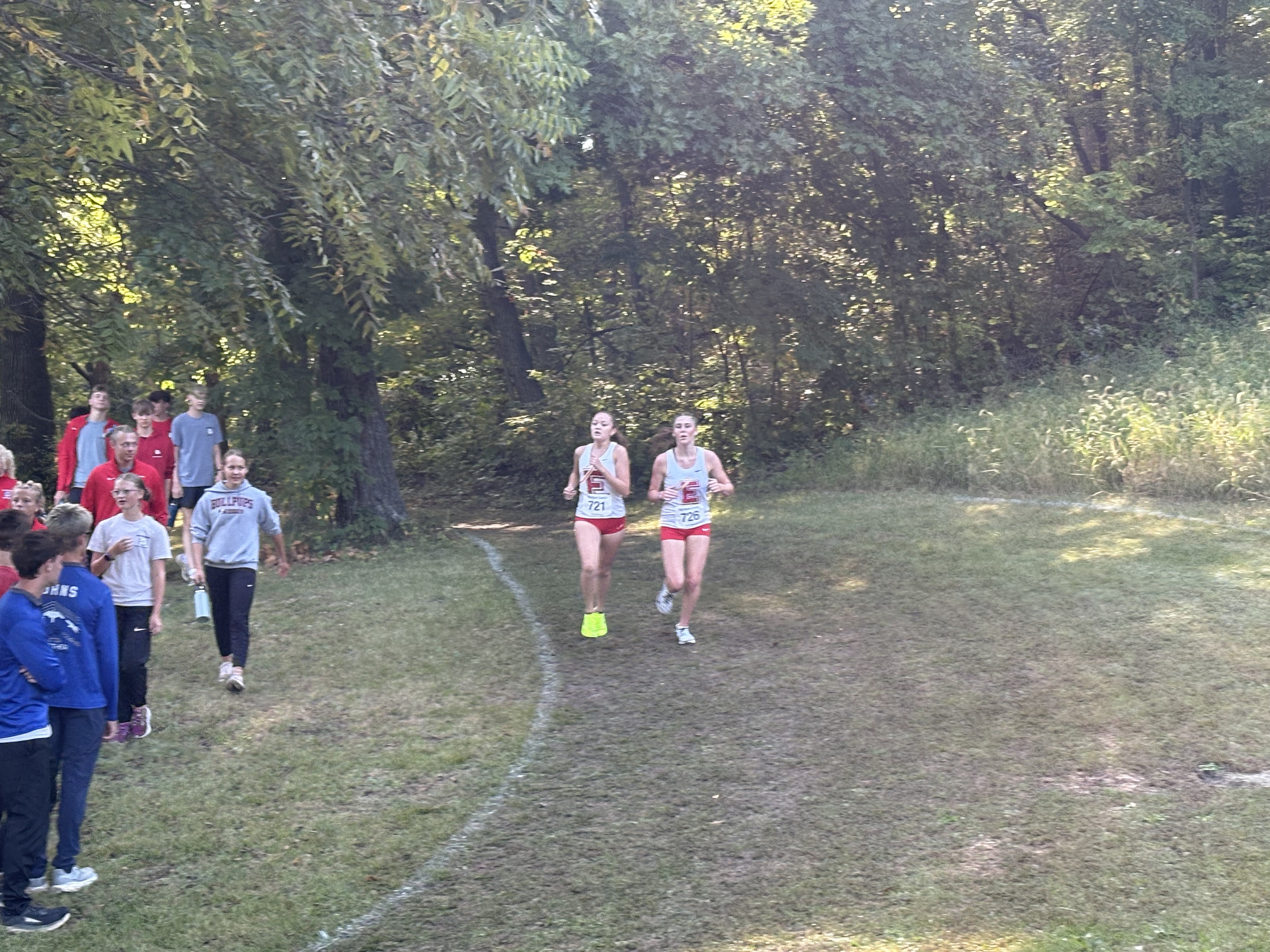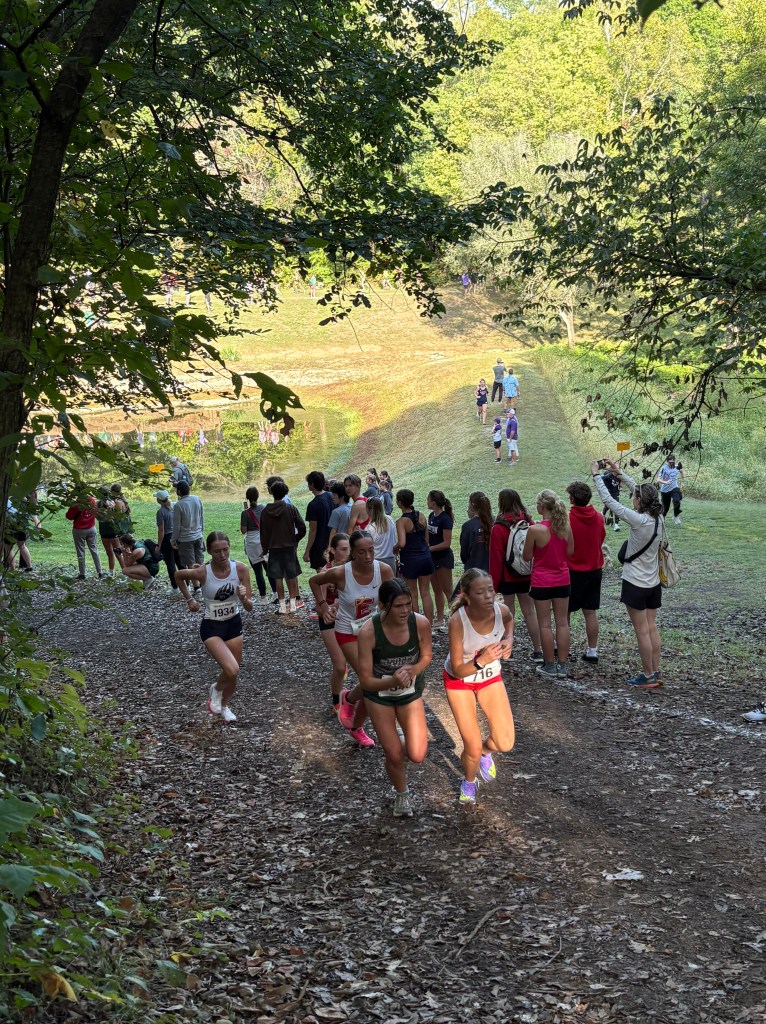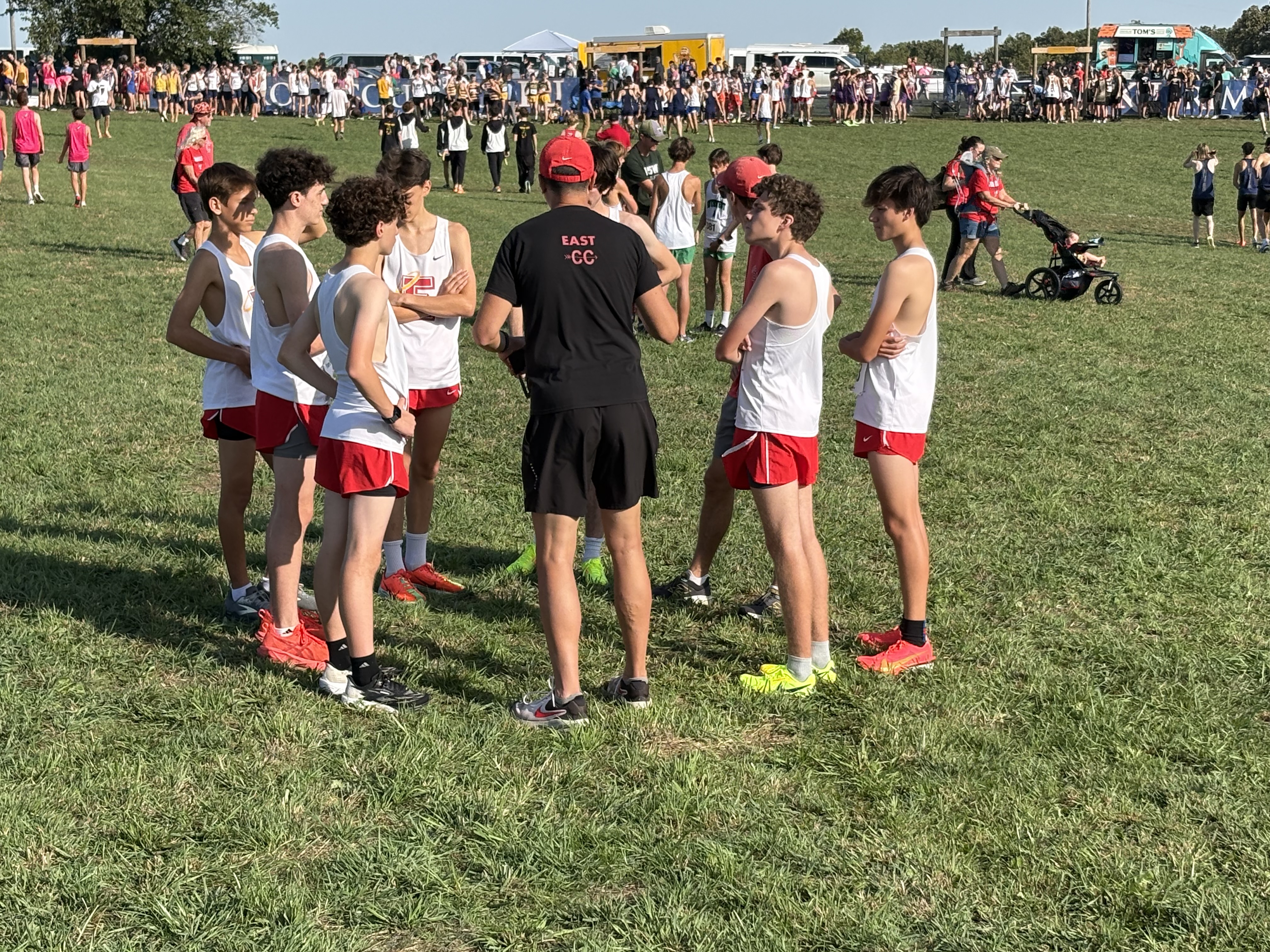 The Flyin’ Ryan was a new meet and course for the Angels, added to the schedule because the course will host the Region 4 Championship in a couple weeks. The course seemed like one on which some fast times would be run, but the combination of hot weather, some stretches with challenging footing, and course length (lack of markings?) moderated speeds a bit. And in a bit of a twist for a meet of this size (24 teams, predominantly smaller schools), there were not classifications – just a boys race and a girls race.
