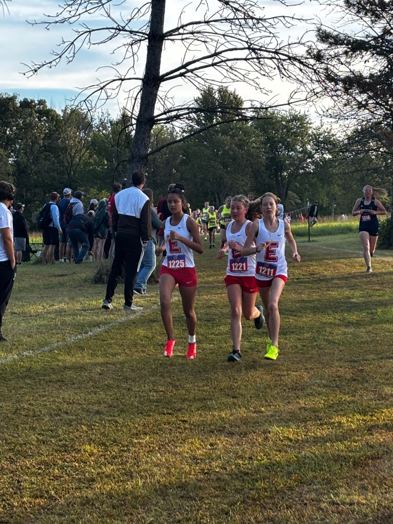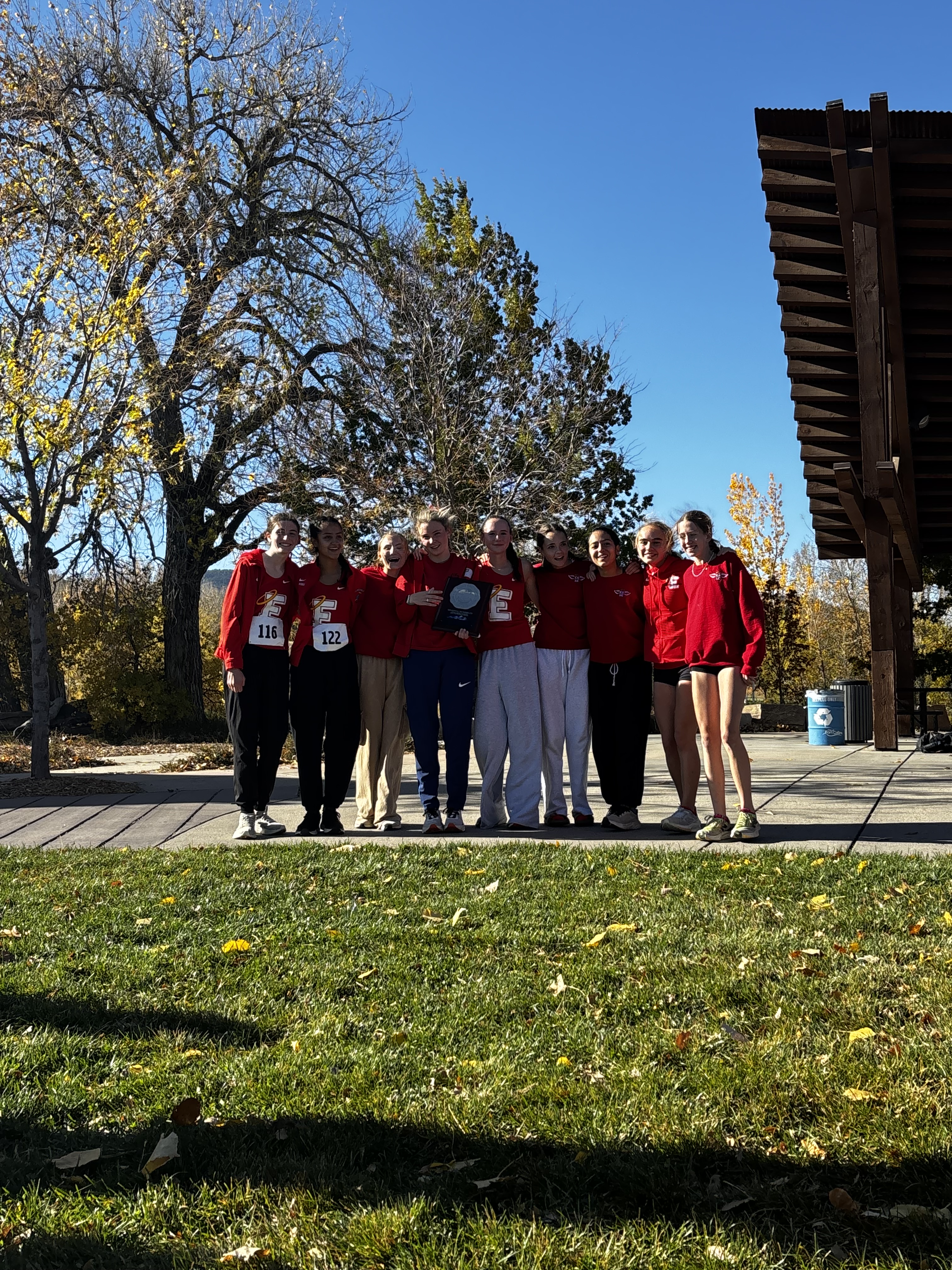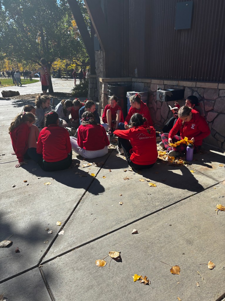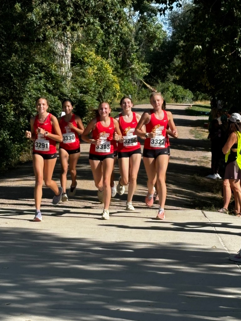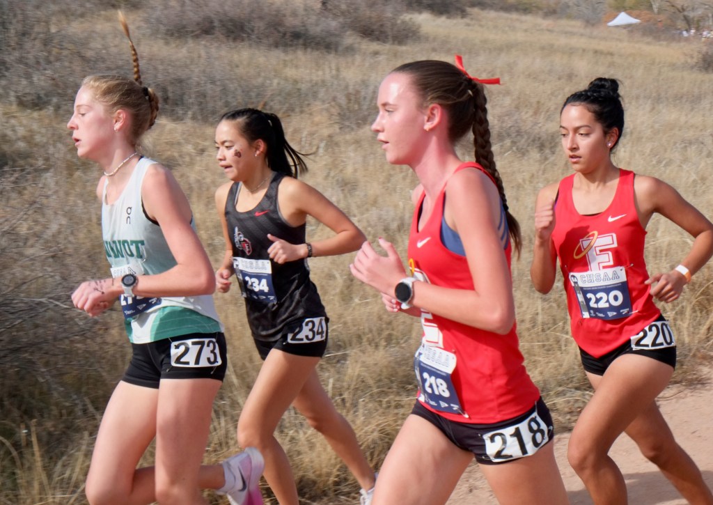 It was a beautiful afternoon for spectating and running at the Norris Penrose Center in Colorado Springs. With the Angels running in two of the last races of the meet, the Girls 5A race was competed under midday sun with temperatures in the low 60’s. Senior Rosie Mucharsky, in her last race in Colorado leading the Angels, which she has done for every race of her East career, raced her way to the awards podium again with a 10th place finish in 17:55, having worked her way up from 15th at the 2-mile mark. Sophomore Corrine Kennedy executed her race plan perfectly, moving up from 78th place at the 1-mile mark to a 56th place finish in 19:28. Junior Julieta Ochoa moved up along side Kennedy much of the race, going from 79th to 68th to finish in 19:46. Sophomore Lola Carhart had one of the best races of her career, moving up from 85th to 75th place in 19:59, followed closely by classmate Avery Johnson in 20:05 for 89th. Junior Scout Chomas was steady, finishing 93rd in 20:10, and ninth-grader Lila Brown finished in 20:28 for 105th in her state meet debut.