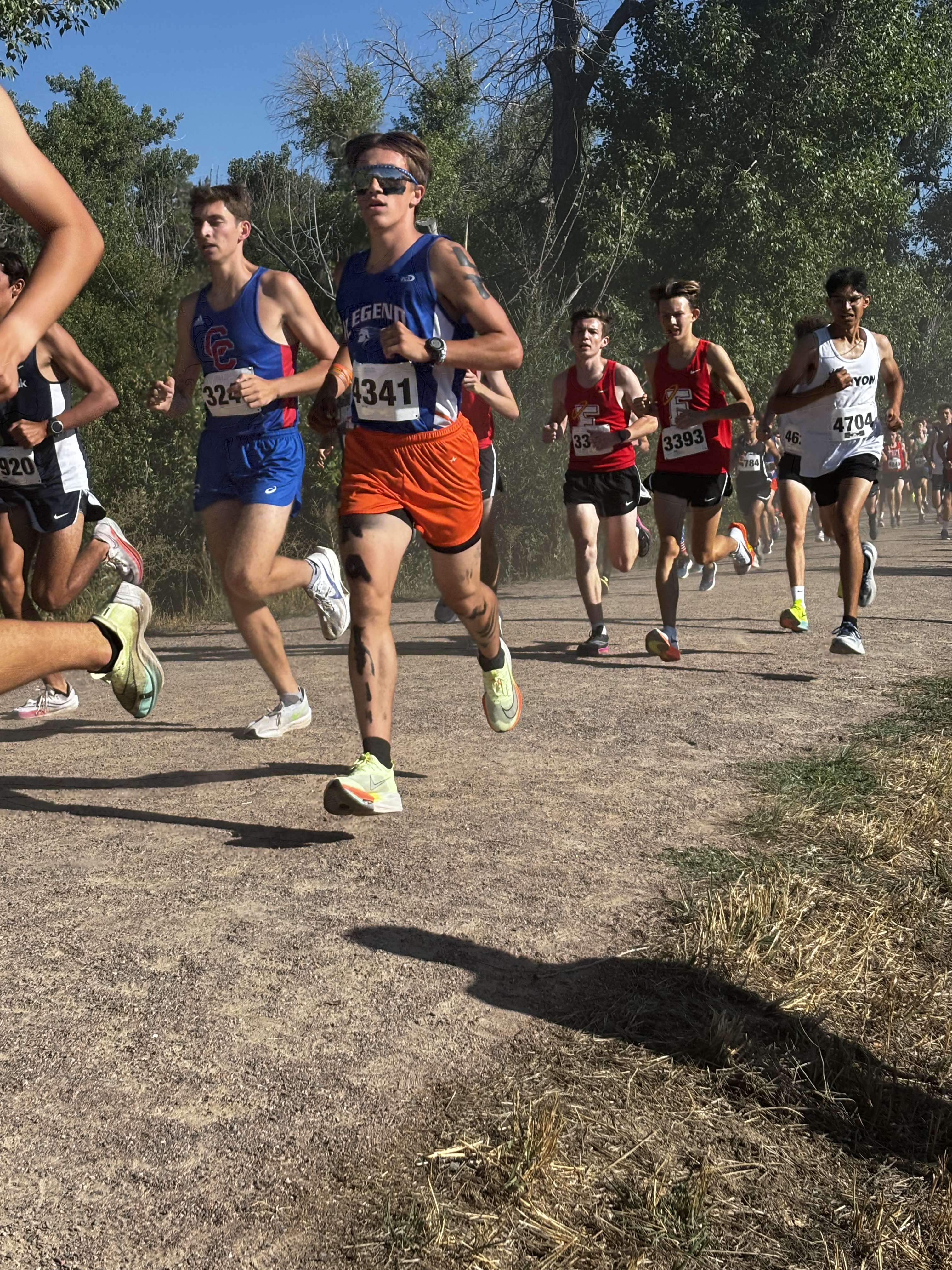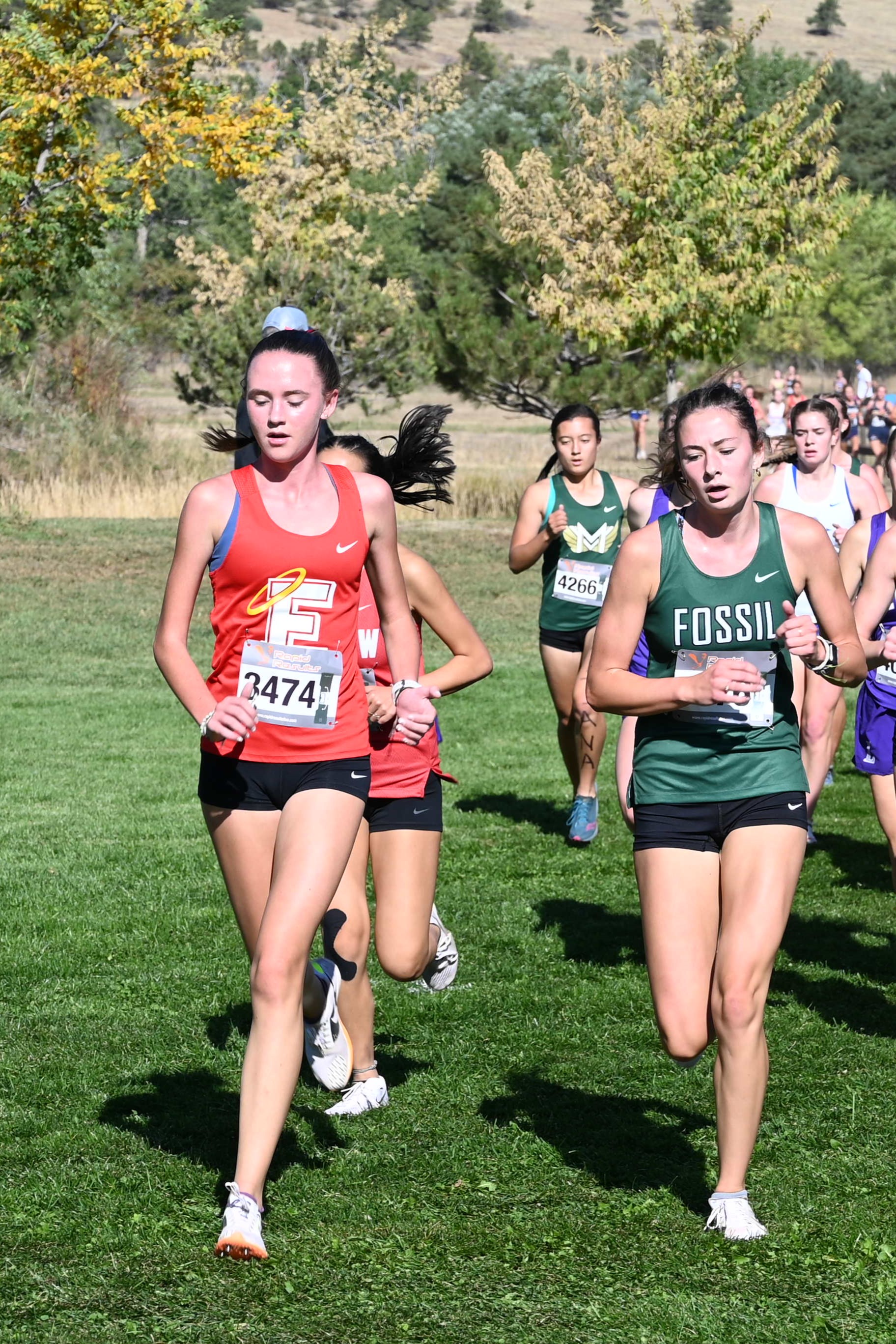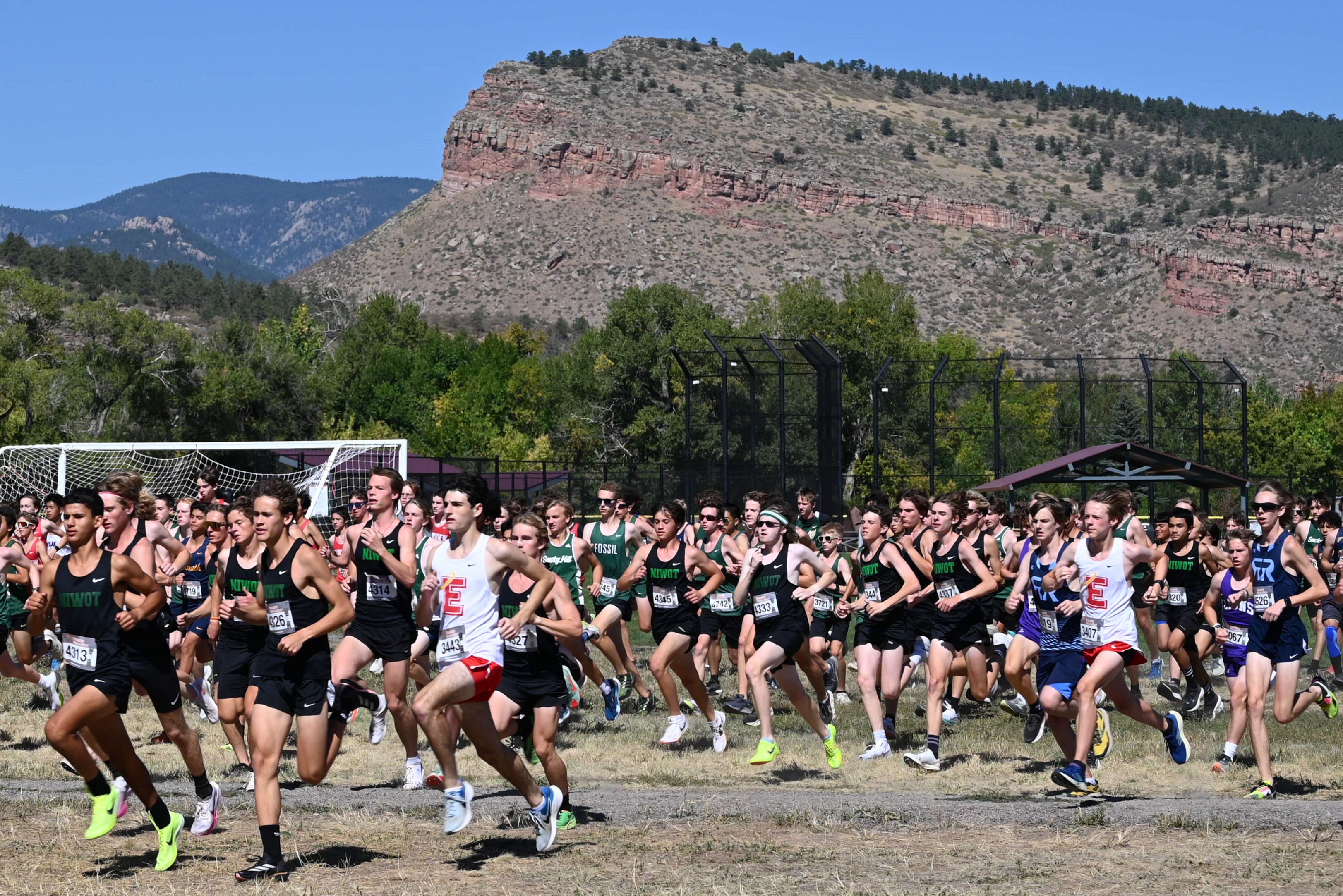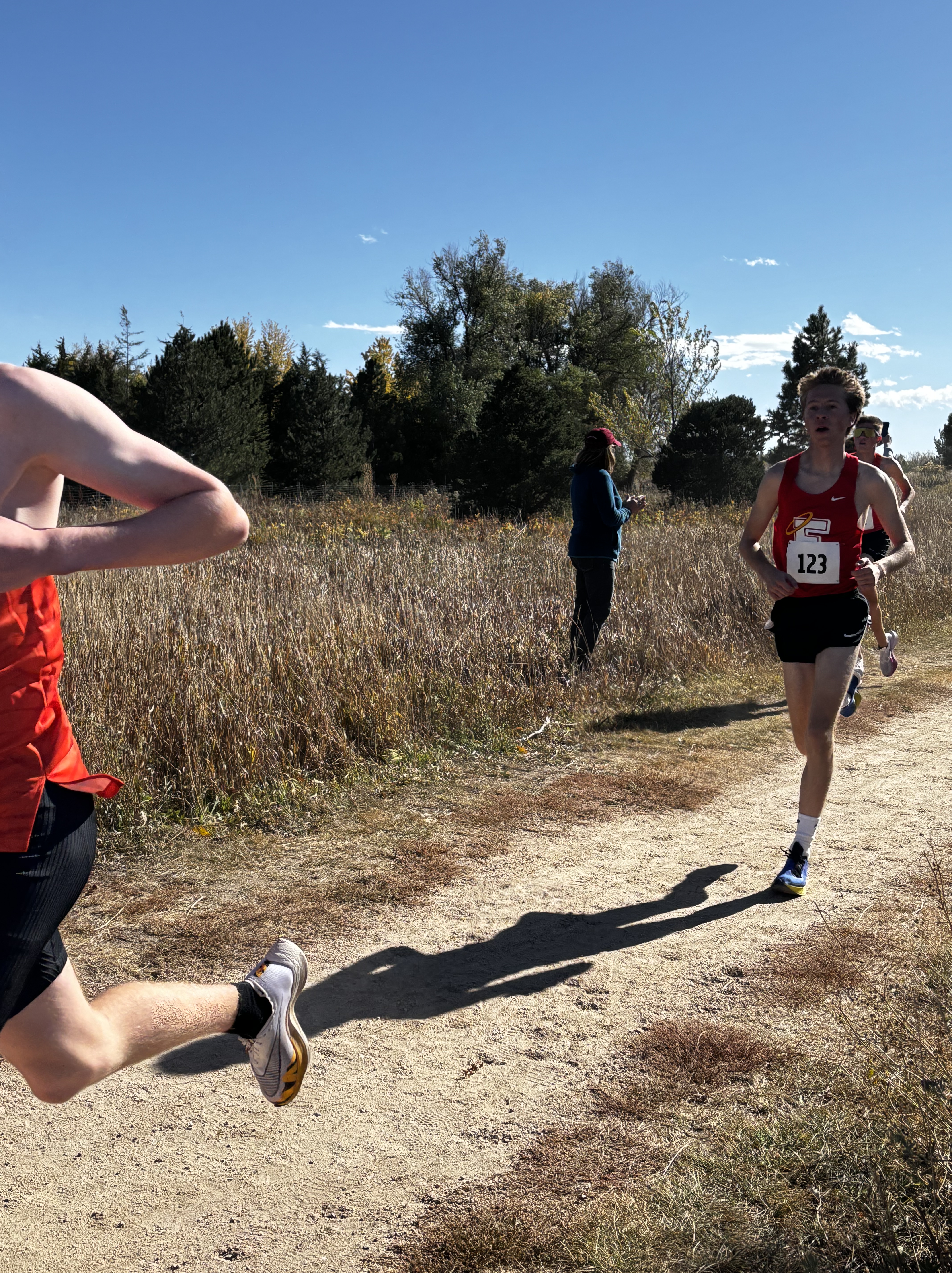 It was a beautiful afternoon for spectating and running at the Norris Penrose Center in Colorado Springs. With the Angels running in two of the last races of the meet, the Girls 5A race was competed under midday sun with temperatures in the low 60’s. Senior Rosie Mucharsky, in her last race in Colorado leading the Angels, which she has done for every race of her East career, raced her way to the awards podium again with a 10th place finish in 17:55, having worked her way up from 15th at the 2-mile mark. Sophomore Corrine Kennedy executed her race plan perfectly, moving up from 78th place at the 1-mile mark to a 56th place finish in 19:28. Junior Julieta Ochoa moved up along side Kennedy much of the race, going from 79th to 68th to finish in 19:46. Sophomore Lola Carhart had one of the best races of her career, moving up from 85th to 75th place in 19:59, followed closely by classmate Avery Johnson in 20:05 for 89th. Junior Scout Chomas was steady, finishing 93rd in 20:10, and ninth-grader Lila Brown finished in 20:28 for 105th in her state meet debut.