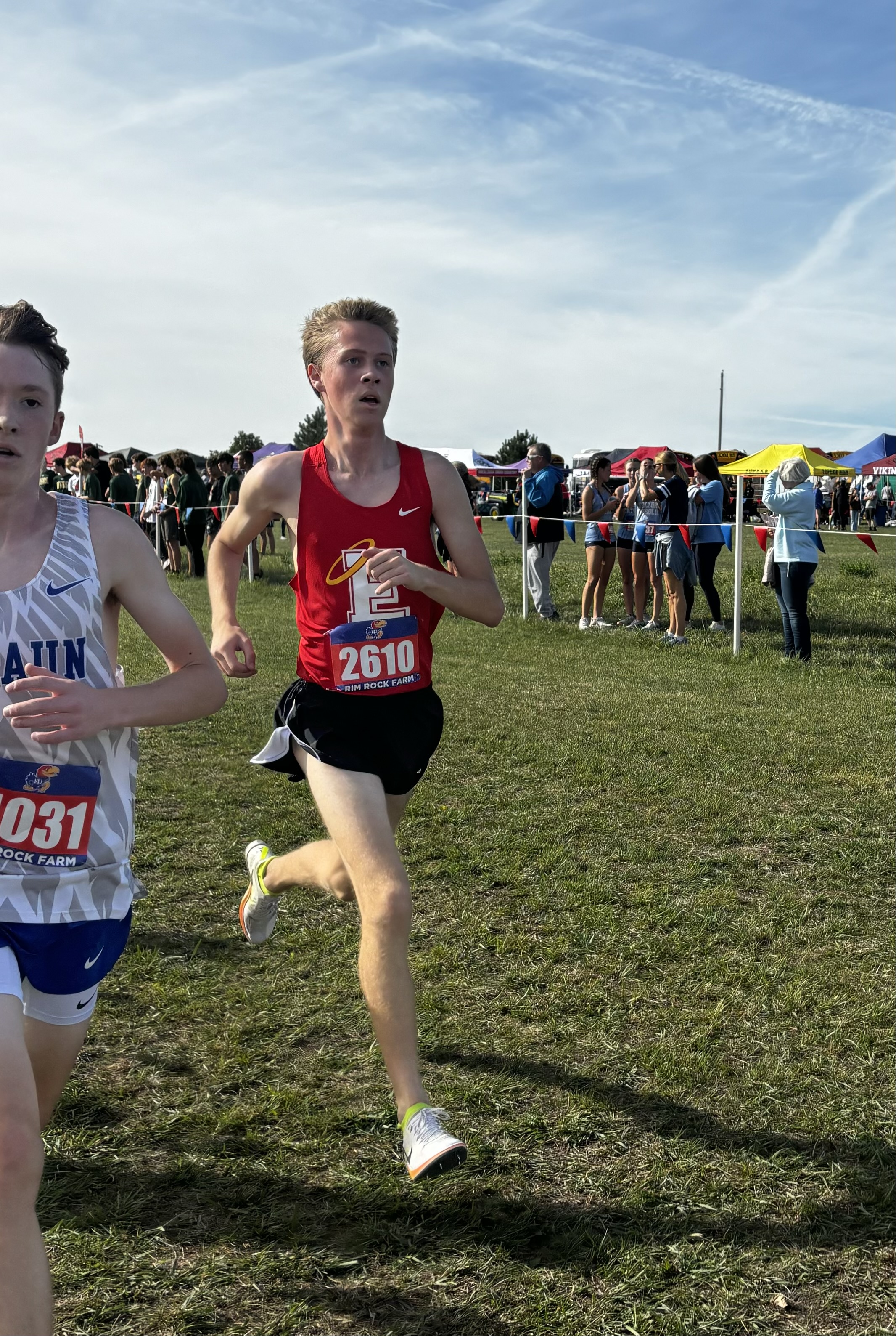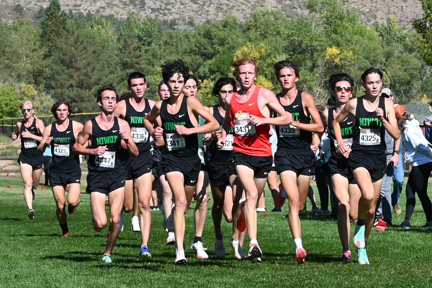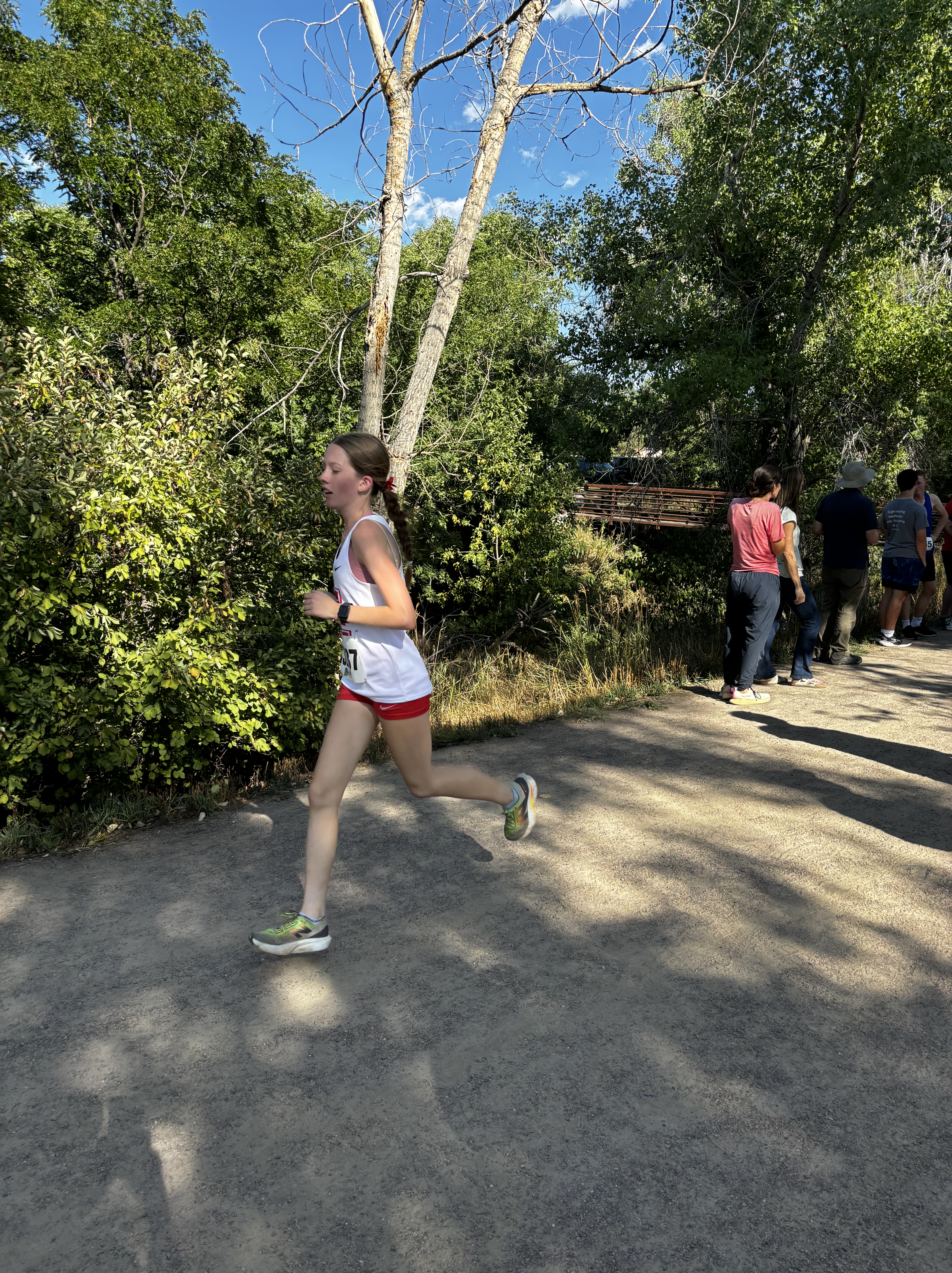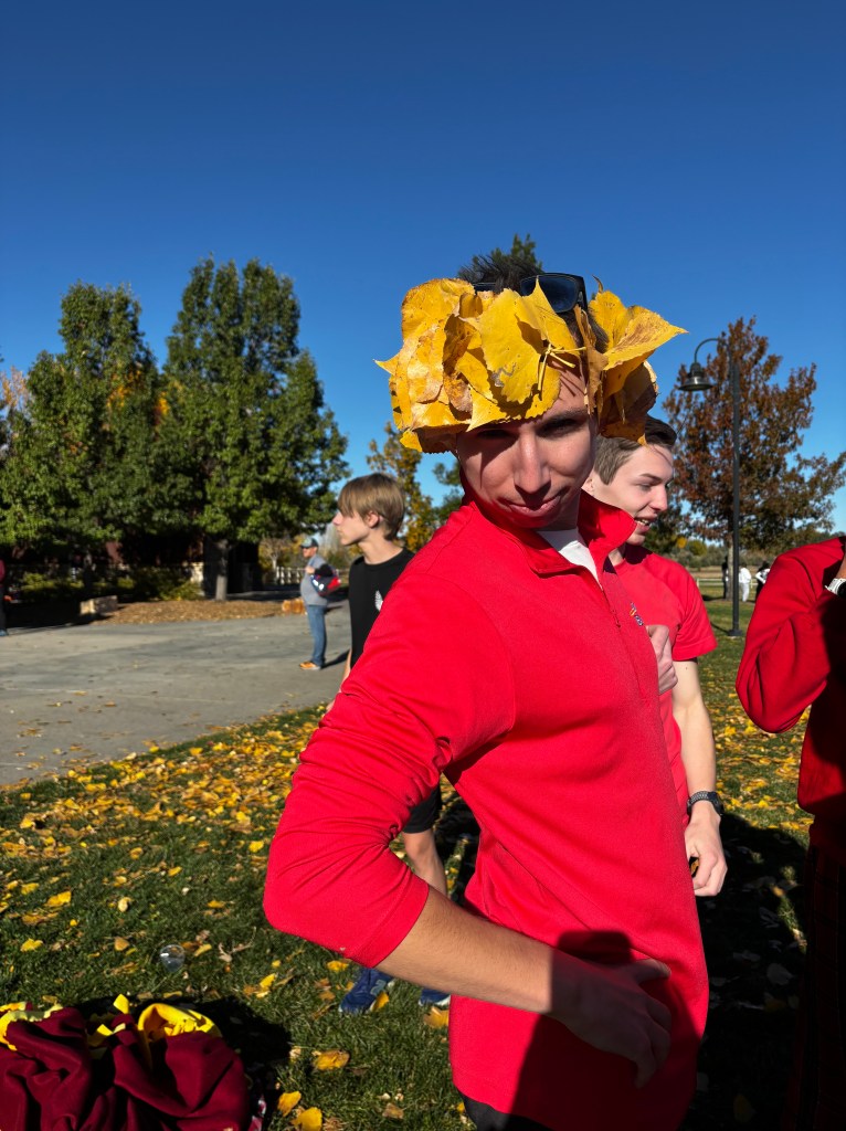 It was a beautiful afternoon for spectating and running at the Norris Penrose Center in Colorado Springs. With the Angels running in two of the last races of the meet, the Girls 5A race was competed under midday sun with temperatures in the low 60’s. Senior Rosie Mucharsky, in her last race in Colorado leading the Angels, which she has done for every race of her East career, raced her way to the awards podium again with a 10th place finish in 17:55, having worked her way up from 15th at the 2-mile mark. Sophomore Corrine Kennedy executed her race plan perfectly, moving up from 78th place at the 1-mile mark to a 56th place finish in 19:28. Junior Julieta Ochoa moved up along side Kennedy much of the race, going from 79th to 68th to finish in 19:46. Sophomore Lola Carhart had one of the best races of her career, moving up from 85th to 75th place in 19:59, followed closely by classmate Avery Johnson in 20:05 for 89th. Junior Scout Chomas was steady, finishing 93rd in 20:10, and ninth-grader Lila Brown finished in 20:28 for 105th in her state meet debut.
